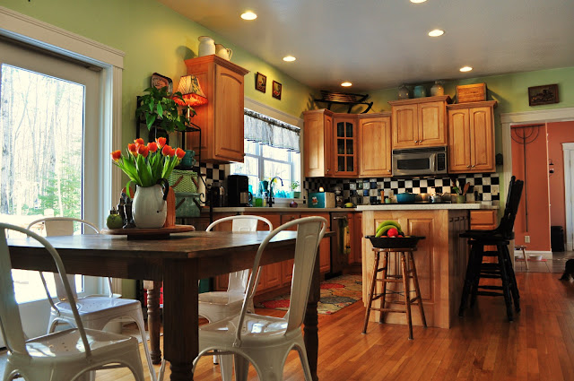 This is my favorite room, not because I do much cooking, I love this room because it represents what I love most about my home; happy colors, vintage collections, plenty of light and comfort.