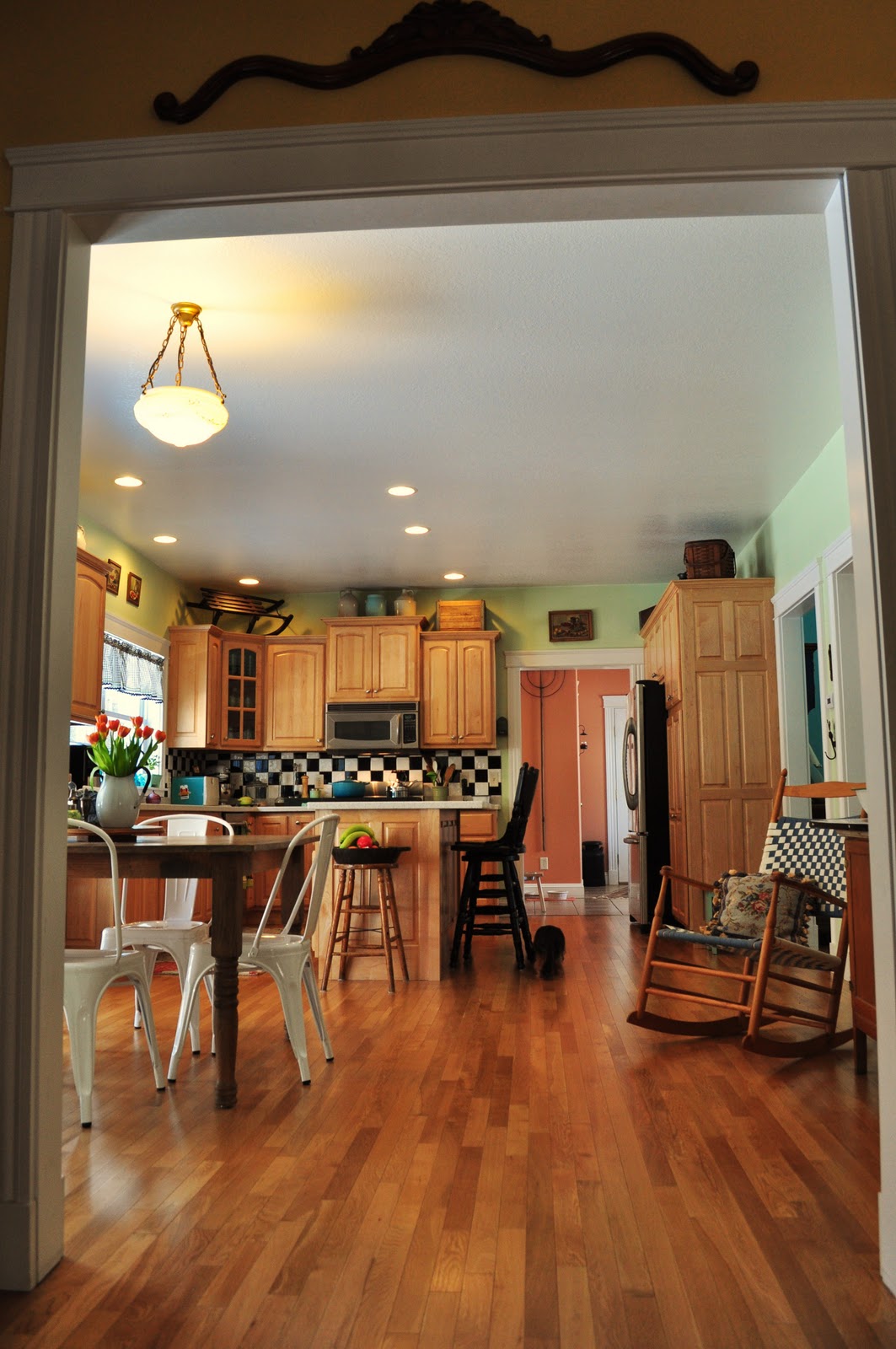 I love the green with the color of your cabinets. Very pretty room. Coming over from Debbie Doos